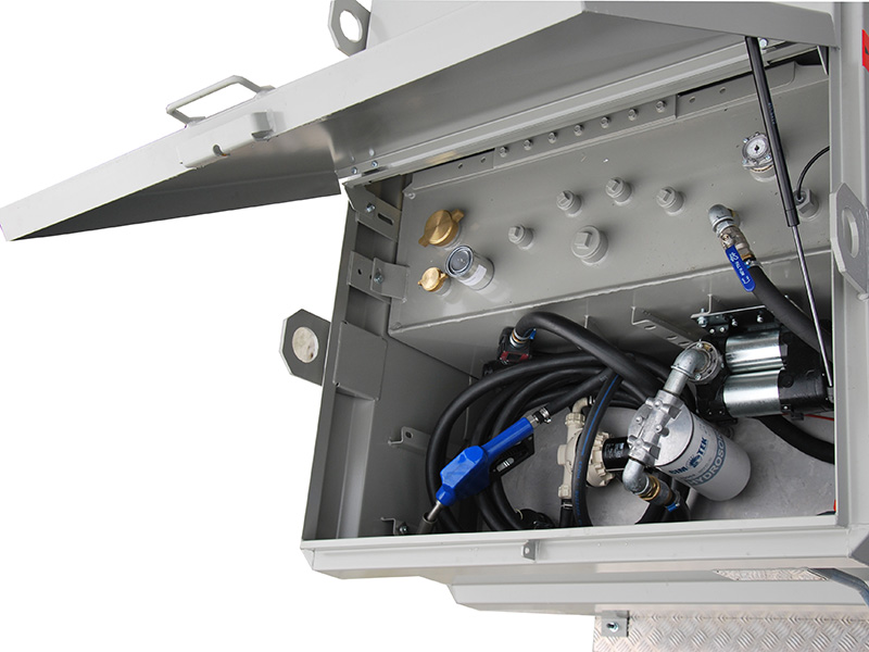 Der kompakte mobile Dieseltank verfügt zusätzlich über ein vorgelagertes Werkzeugfach.