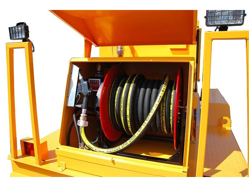 Fahrbarer mobiler Dieseltank. Das kompakte Design bietet praktische Servicefächer mit hydraulischen Deckeln.